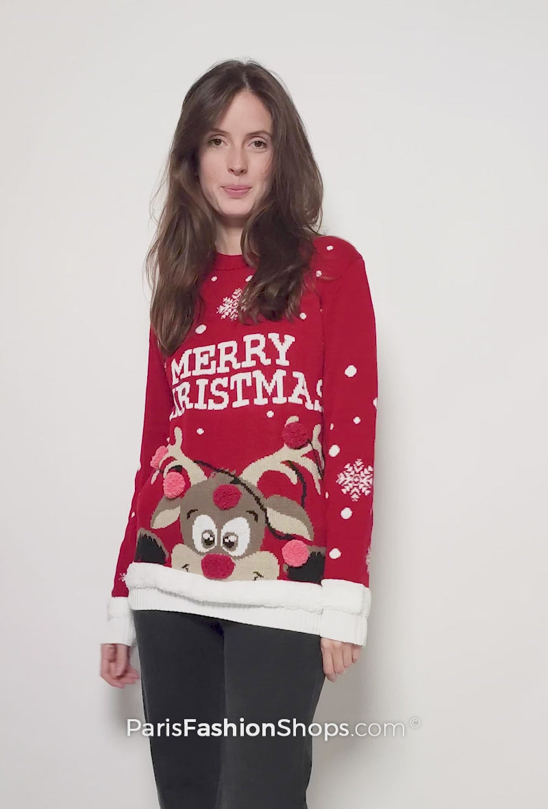 Intră în atmosfera Sărbătorilor de Iarnă și bucură-te de magia Crăciunului cu acest pulover vesel! Renul ghiduș cu nas roșu din pompom va fi partenerul tău de distracție, te va bine dispune și te va încălzi dacă va fi frig!